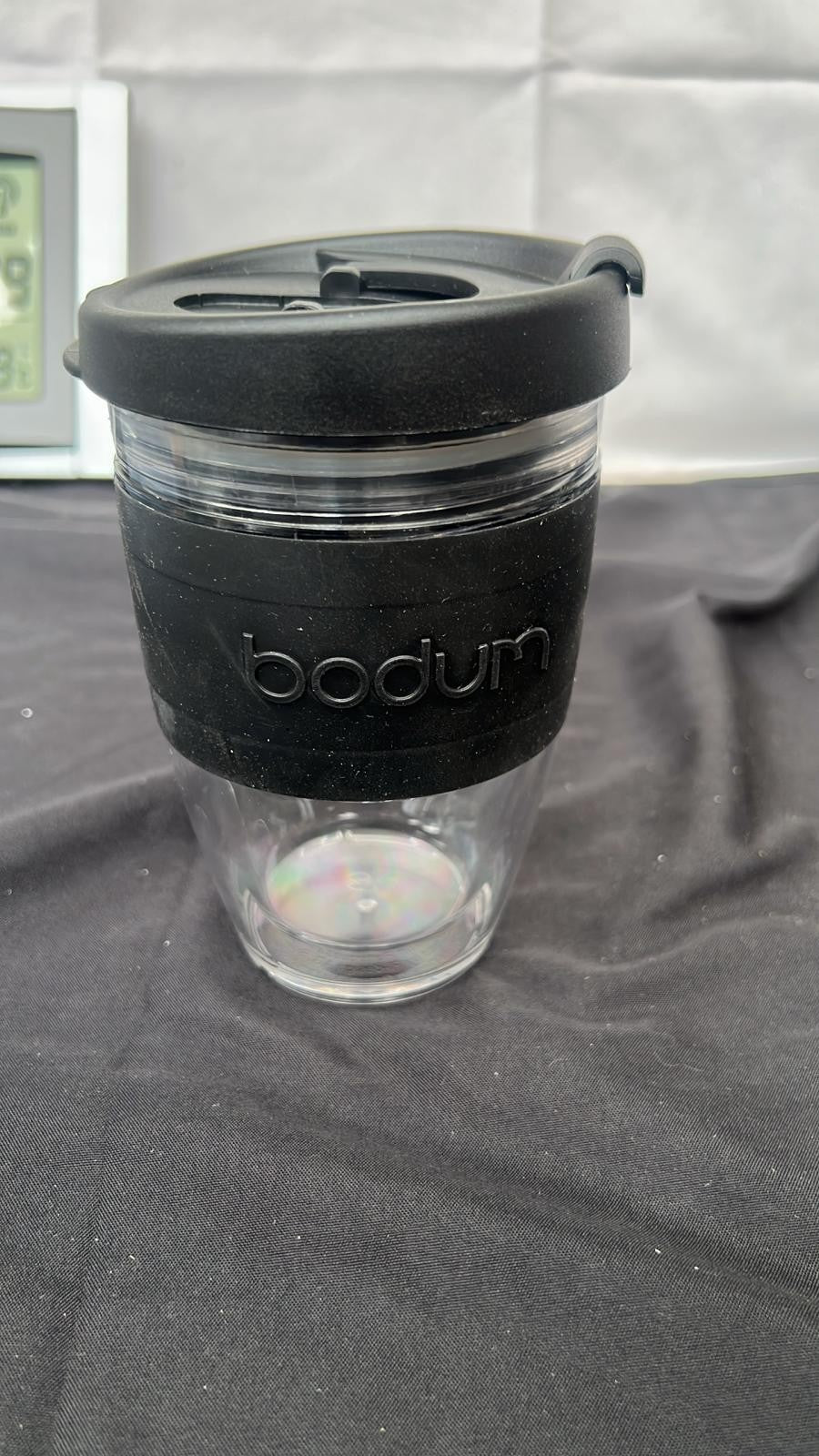 - BODUM JOYCUP Travel Mug, double wall, 0.25 L, black band, Plastic