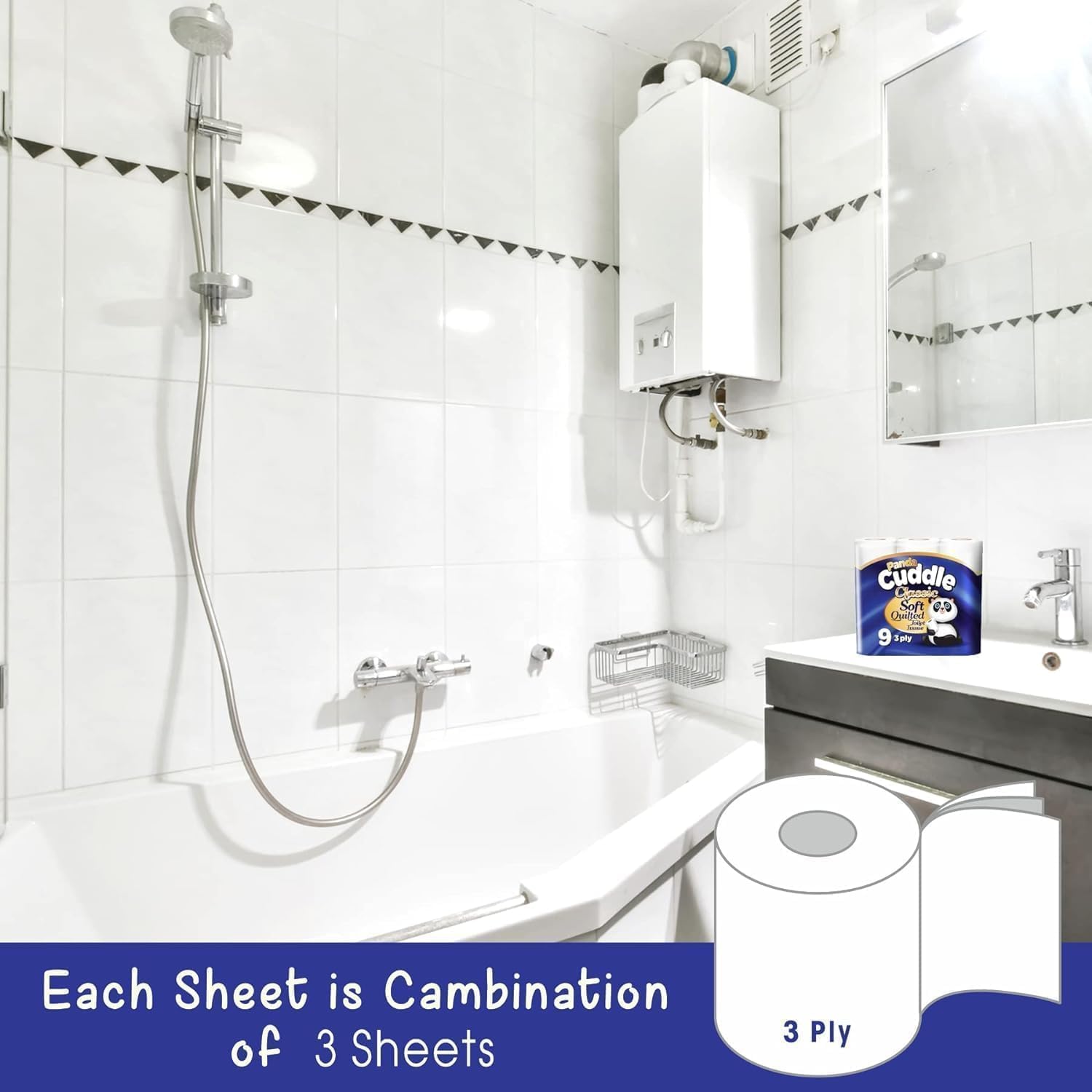 Experience luxury and cleanliness with Panda Cuddle 3-Ply Soft Quilted Unscented Toilet Rolls, the ultimate choice for premium bathroom tissue. Each pack of 9 rolls ensures you're always stocked with top-quality toilet paper for your household needs. Crafted with three layers of softness, each roll offers a plush touch that enhances your bathroom experience. The quilted texture adds an extra level of comfort, providing a spa-like sensation with every use. Our toilet rolls are unscented, perfect for those with sensitive noses or allergies. Enjoy a fresh and clean feel without any overpowering fragrances, ensuring a pleasant experience for all. Elevate your bathroom routine with Panda Cuddle Toilet Rolls. Prioritize comfort and hygiene with unmatched softness and cleanliness in every roll, conveniently packaged in a pack of 9 for your convenience."